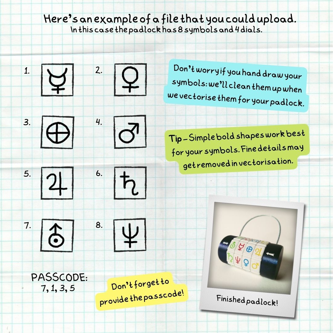 Please upload a file that depicts the symbols you want to appear on the dials of your padlock. Don't forget to indicate the passcode in this file too! The password cannot be changed after manufacture. Please click here for an example of what to upload. If you're stuck, please send us a message via our contact page and we'll be happy to help.